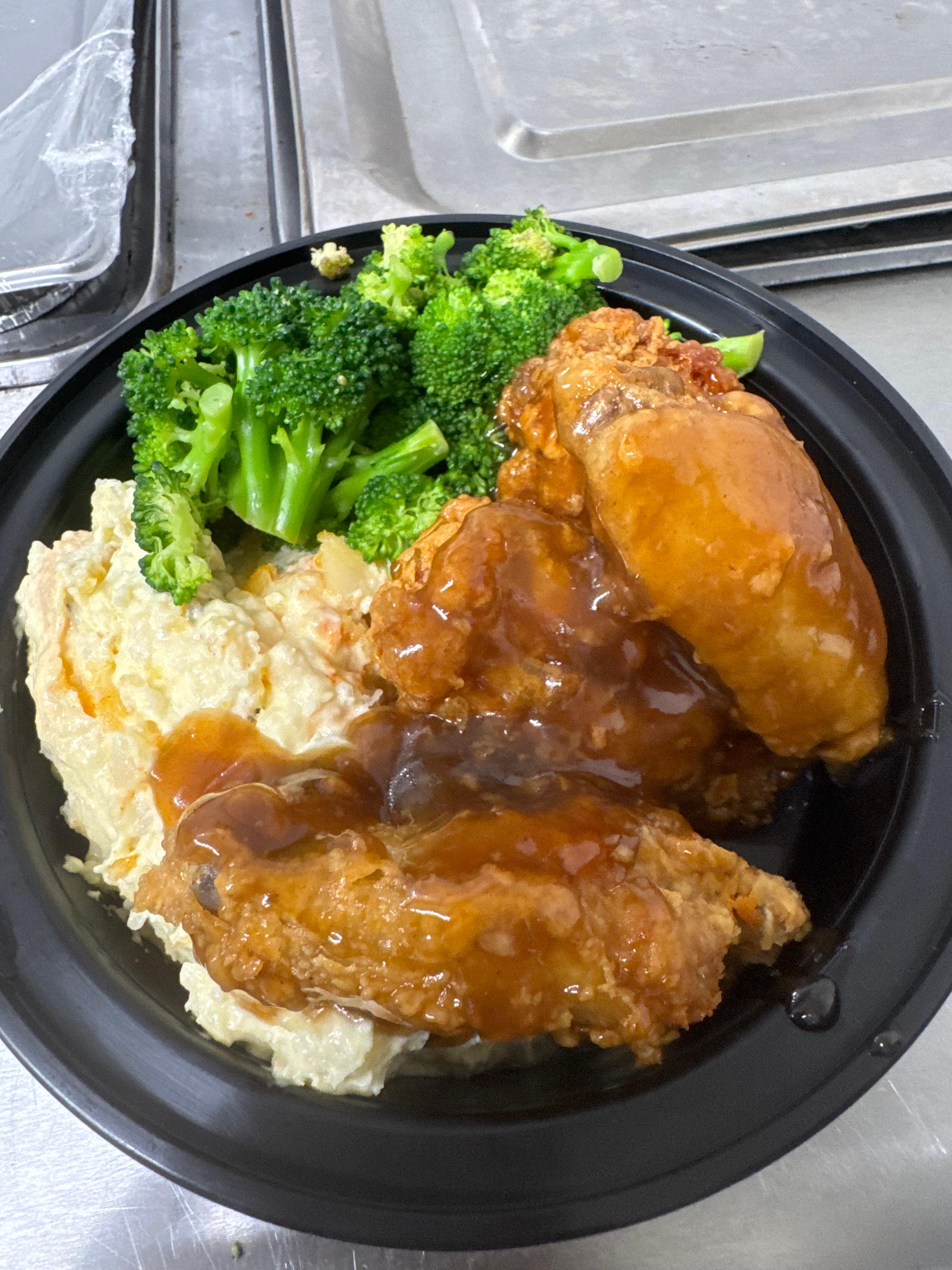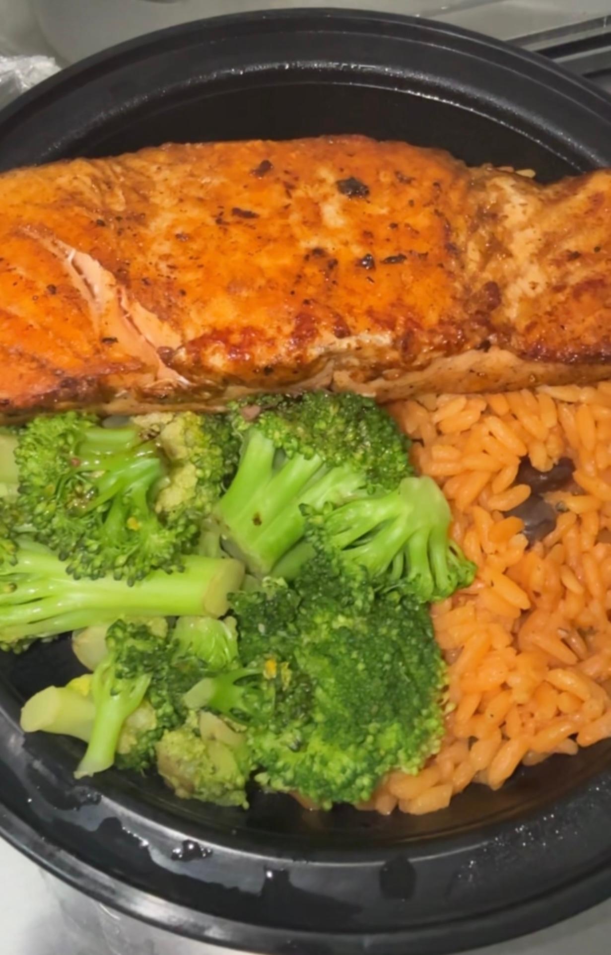 Grilled Chicken or Salmon topped with teriyaki sauce, served with grandma rice and a side of sautéed broccoli.