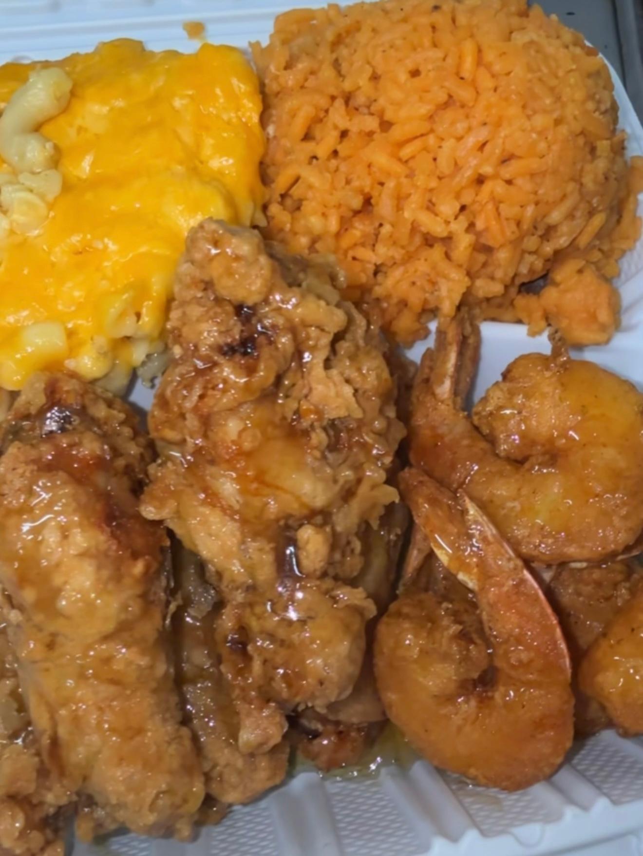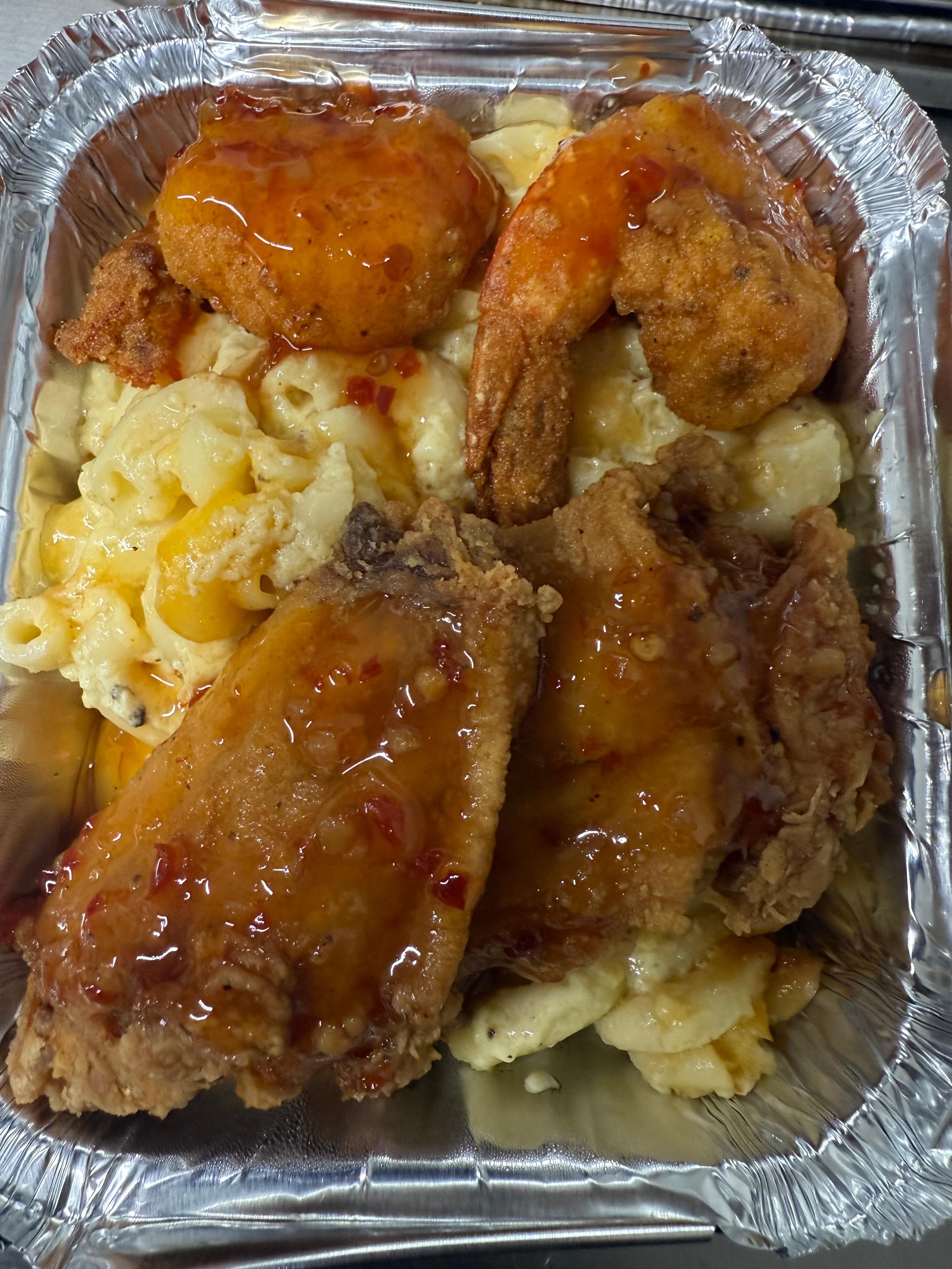 Our $8 Holla includes 2pc fried chicken wings with 2 piece fried shrimp with our infamous Mac & Cheese!