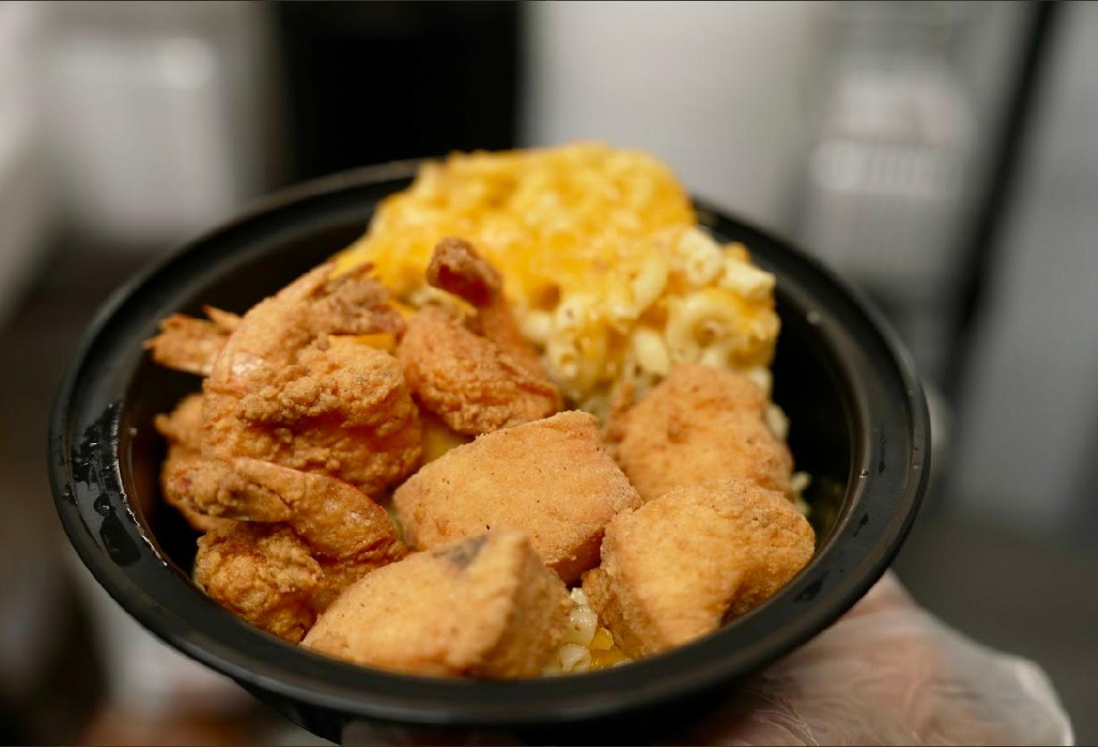 The seaside bowl includes 4pc fried or grilled Salmon bites and 4pc Fried or grilled Shrimp with Krack Mac (Mac and Cheese).
