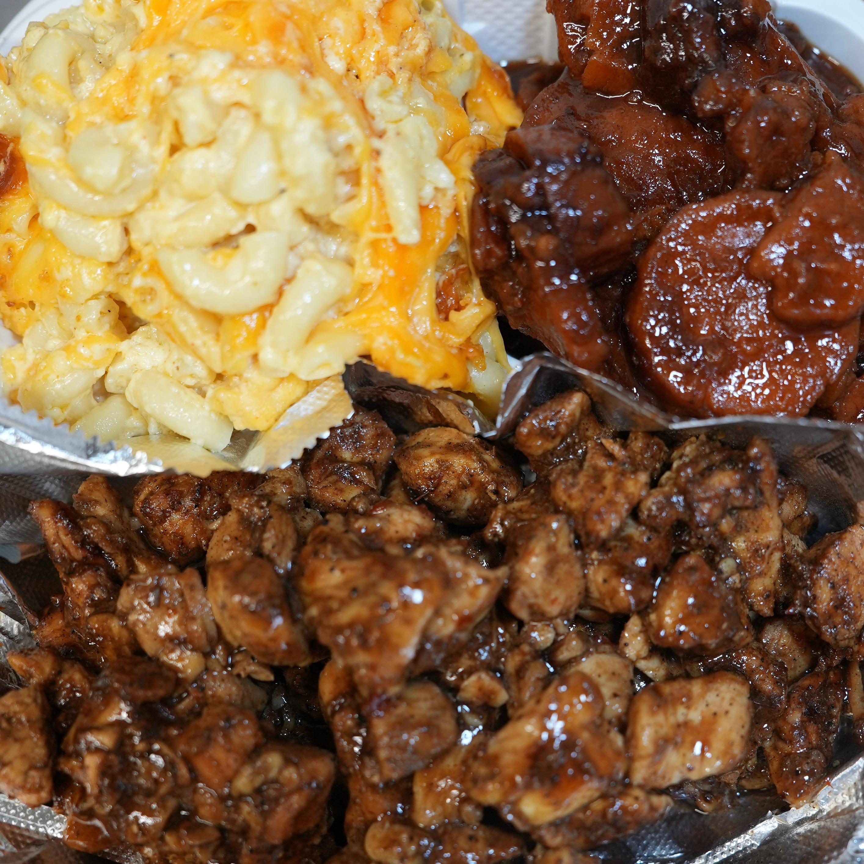 Three marinated jerk chicken breasts with your choice or 2 Premium sides, Suggested with Jerk BBQ Sauce & Cayman Sauce