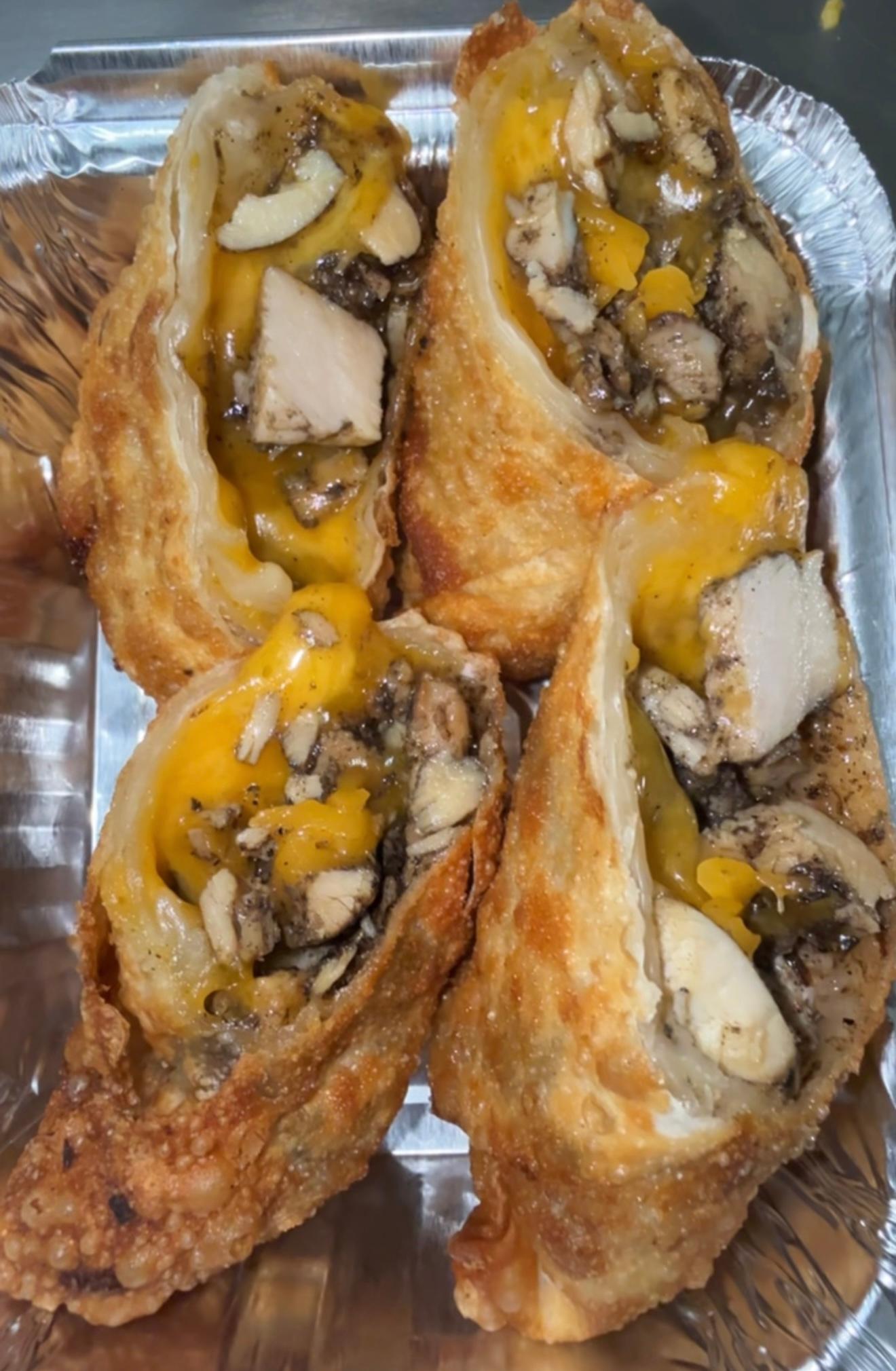 Marinated Jerk Chicken + Cheese wrapped in an egg roll fried to perfection. Suggested with Jerk BBQ sauce or Sweet Chili