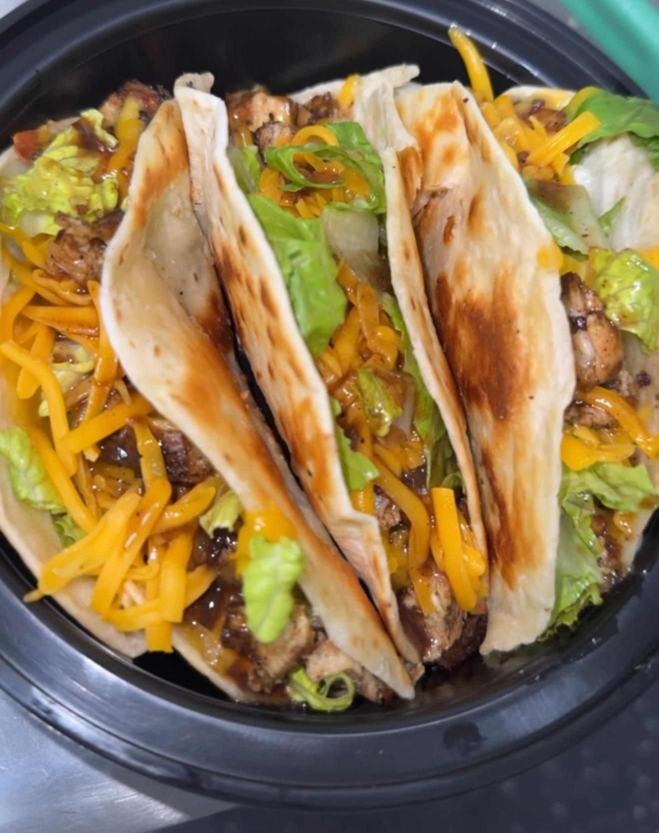Enjoy a trio of our flavorful jerk chicken taco! Each taco is packed with tender, marinated jerk chicken, lettuce and cheese.